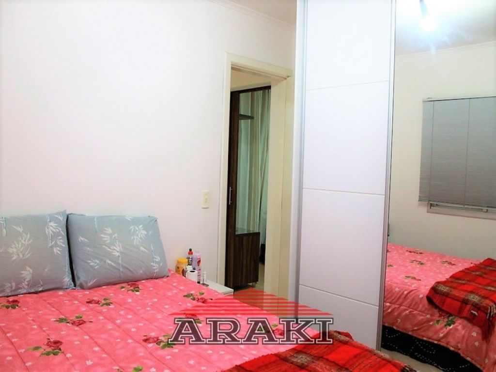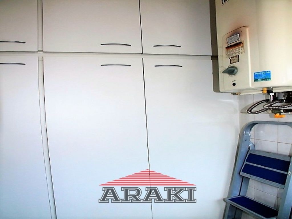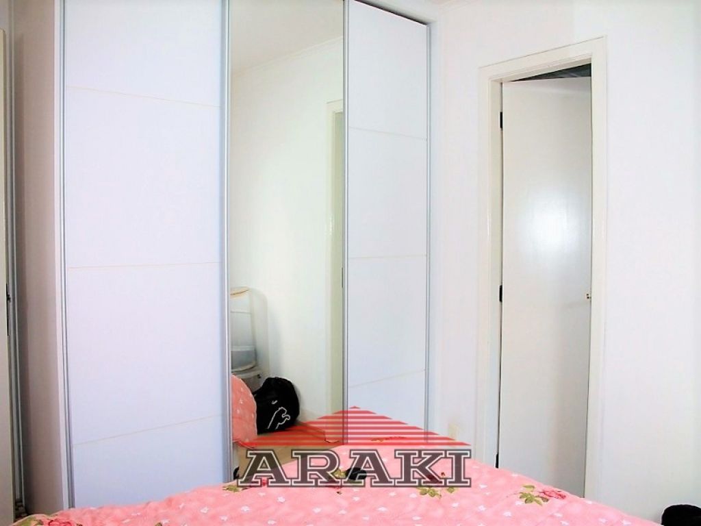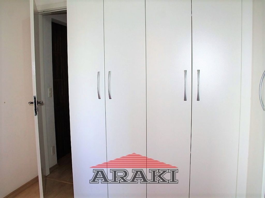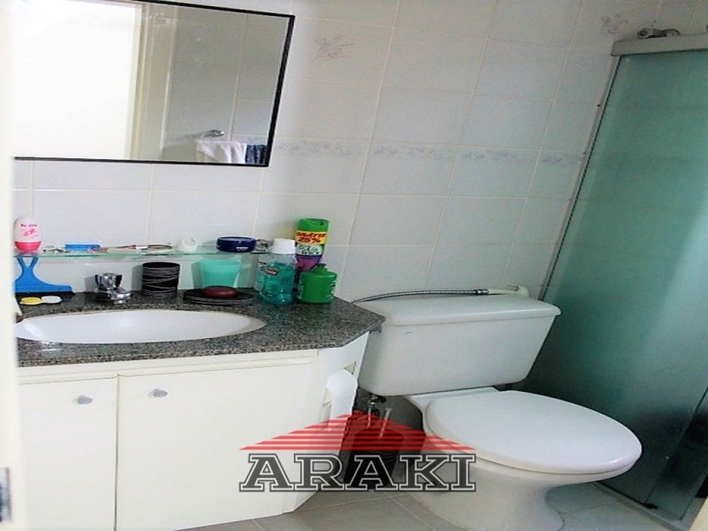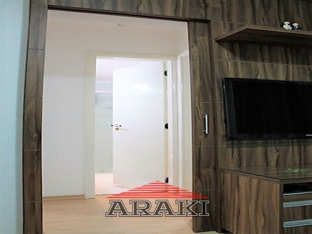 Painel na sala, armários e pia de granito na cozinha e nos dormitórios, laminado de madeira, box de vidro, espelho e gabinete no banheiro.