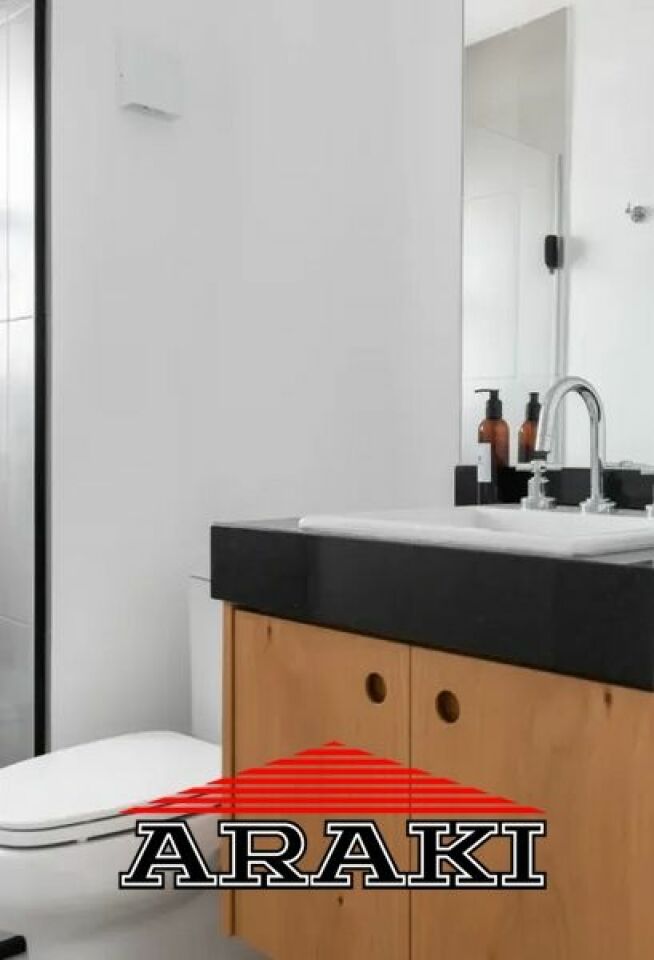 * Banheiro com gabinete, espelho, box e chuveiro a gás